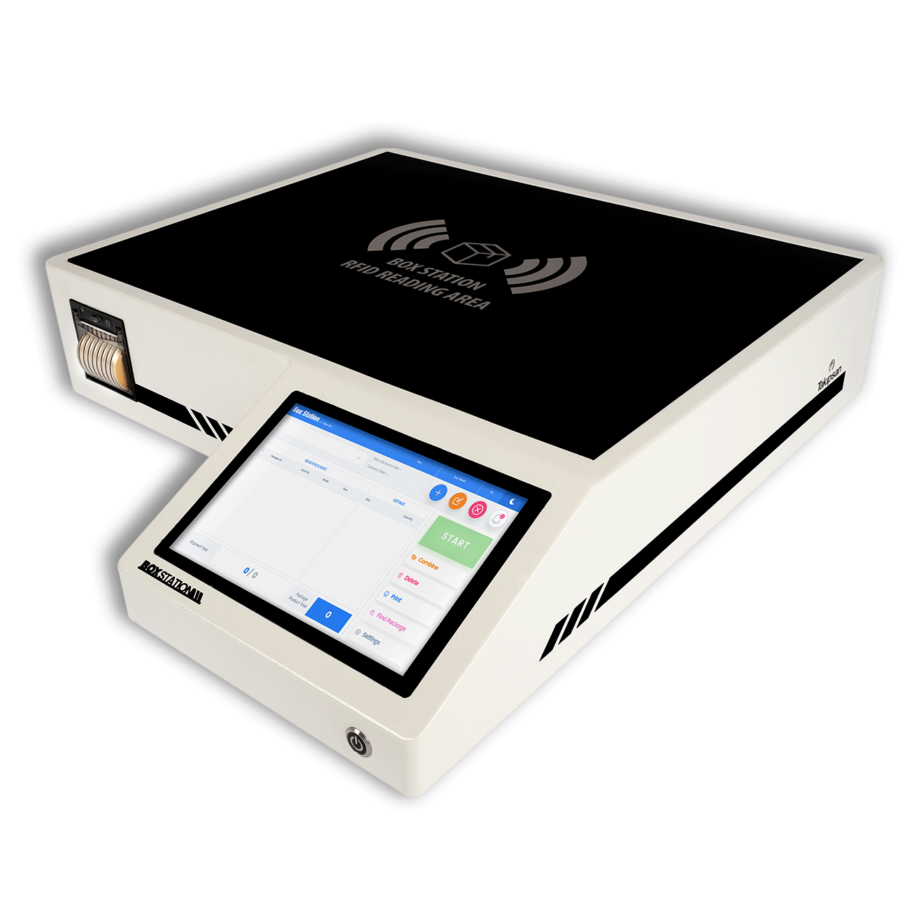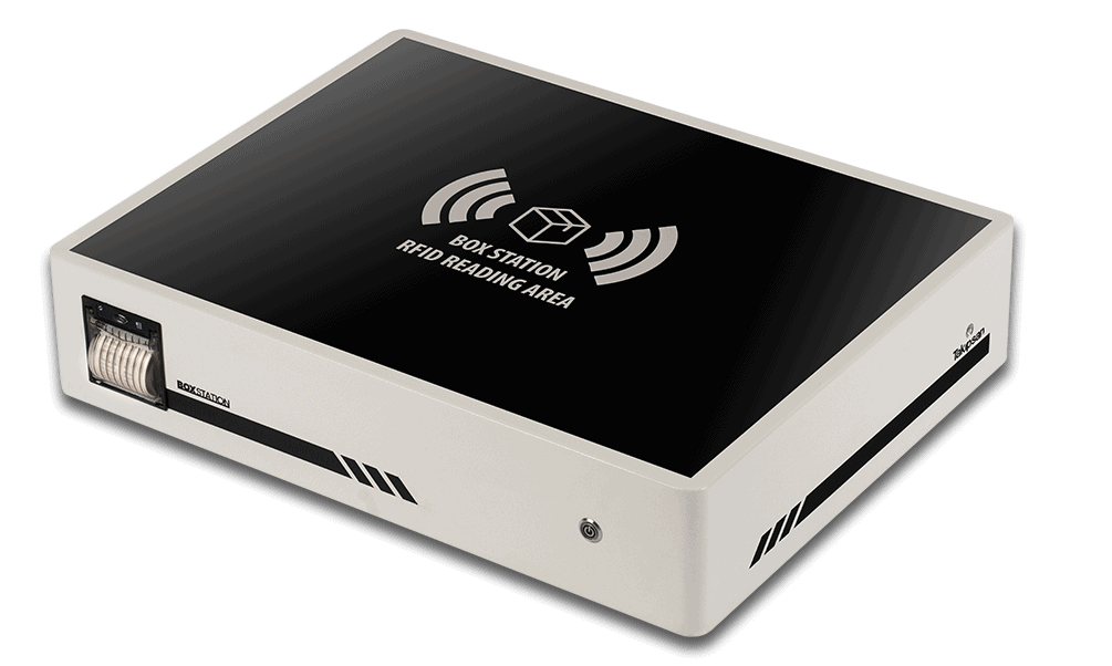 Compared to its upgrade model, Box Station needs an external computer a lap top to work with. Device uses the lap top’s network connection to operate. It is a plug play solution. Only requirements are a lap top that is connected to internet power adaptor. It has the capacity to read 250 tags per second. Mini printer can be installed as an option, printing the read box information on stickers.